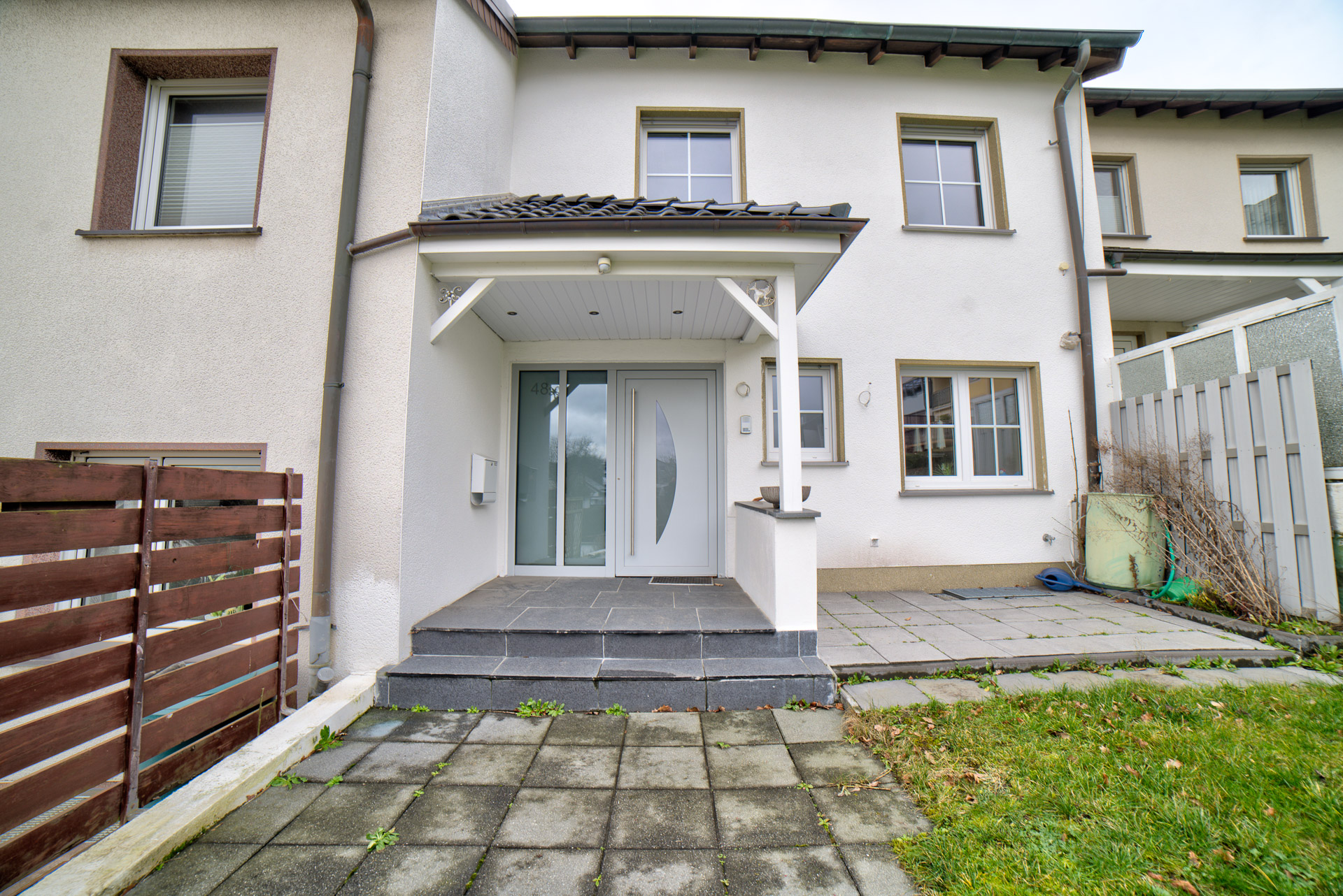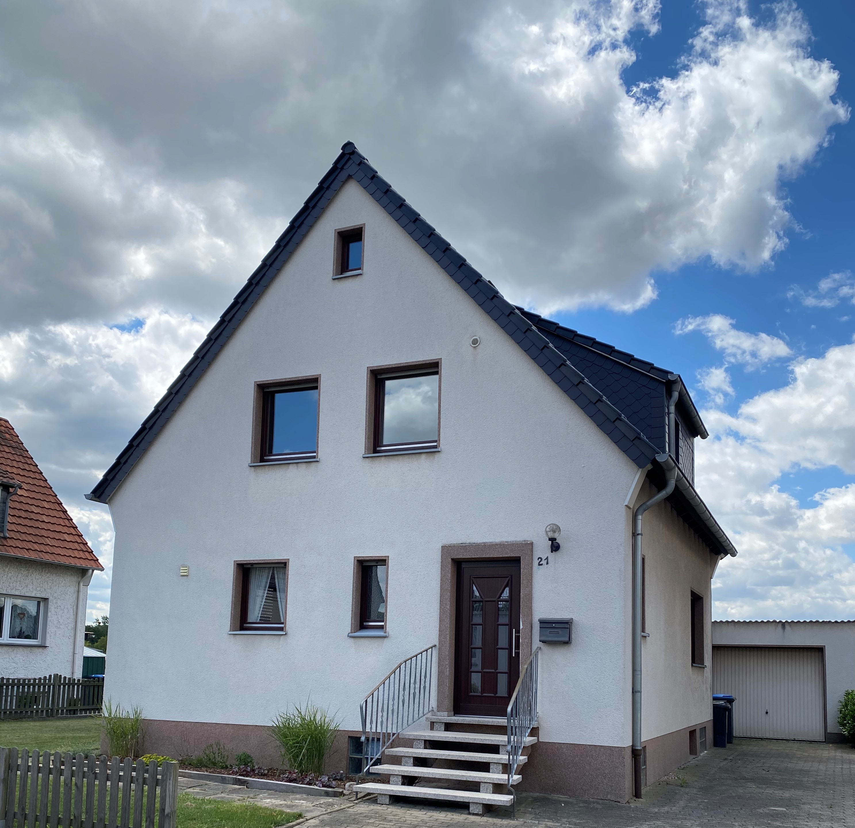 Das Einfamilienhaus wurde im Jahre 2000 in konventioneller Bauweise, zweigeschossig mit einem Krüppelwalmdach erstellt. Das Grundstück bietet ausreichend Platz für zwei Stellplätze vor dem Haus und einem ansprechenden Gartenbereich. Durch eine geräumige Garage im Haus, die einen direkten Zugang ins Haus ermöglicht, wird weiterer Stellplatz geschaffen. Abgerundet wird das Angebot von einem großzügigen Terrassenbereich mit anliegendem Garten.