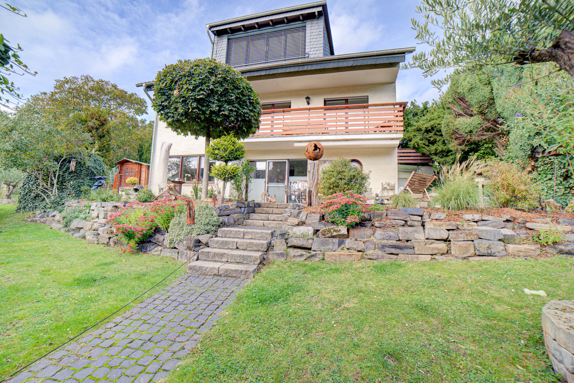 Insgesamt ca. 65 m² Terrassenflächen und der unverbaute Blick laden zum gemütlichen Verweilen im Garten ein.